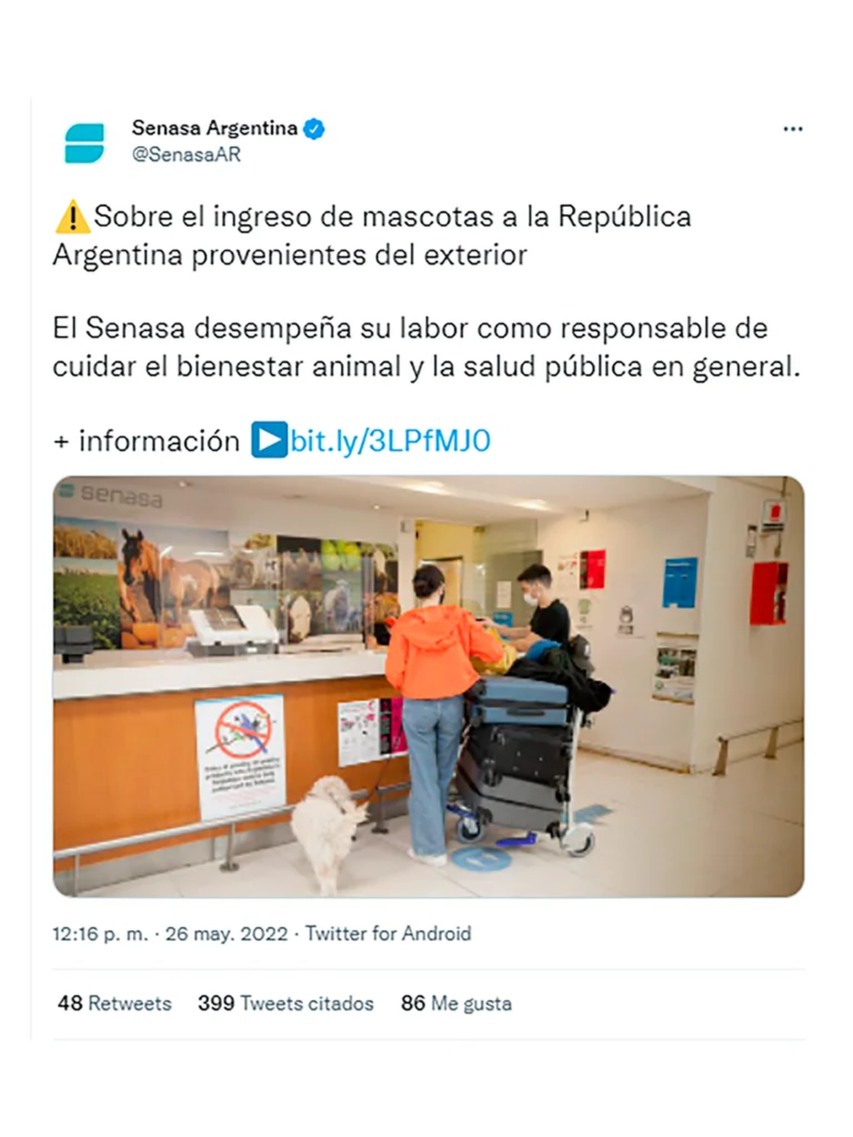 El tuit del Senasa sobre la situación de Coco