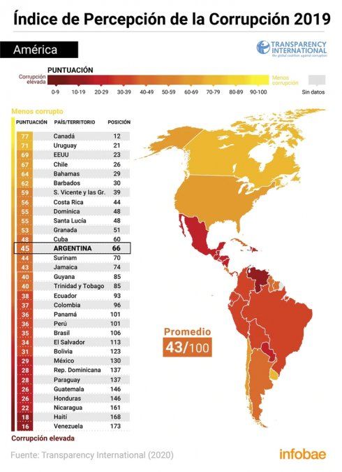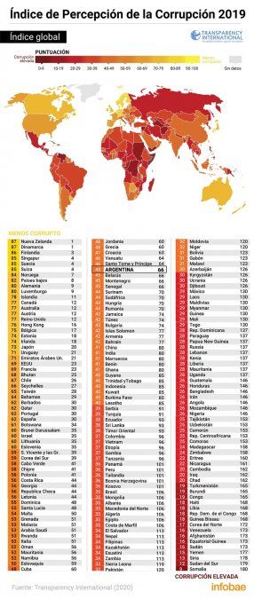 La Argentina logró un avance en materia de corrupción durante 2019 al mejorar su puntuación en el Índice de Percepción que cada año elabora la ONG Transparency International, ya que logró trepar del puesto número 85 en 2018 al 66, sobre un total de 180 países.