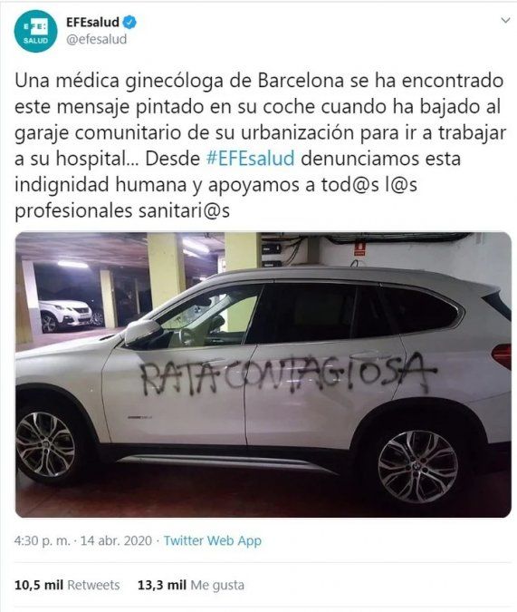 Lamentablemente, algunos trabajadores han sufrido ataques deplorables de sus vecinos. Este miércoles se conoció el caso de una médica de Barcelona que cuando estaba a punto de salir a trabajar tomando todas las previsiones necesarias, encontró su auto pintado con un indignante mensaje, según cuenta Mariale Barradas.