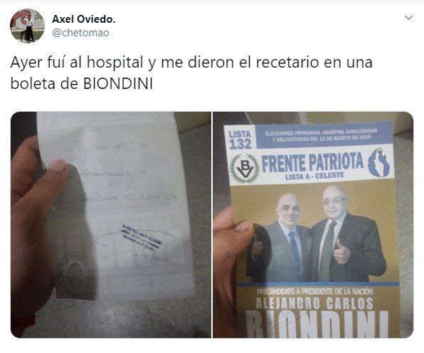 “Ayer fui al hospital y me dieron el recetario en una boleta de Biondini“, escribió el usuario Axel Oviedo. En la foto que compartió se puede ver claramente cómo los médicos escribieron la receta en el dorso de la boleta electoral. Los comentarios sobre la publicación no se hicieron esperar y superó los 15 mil “me gusta”.