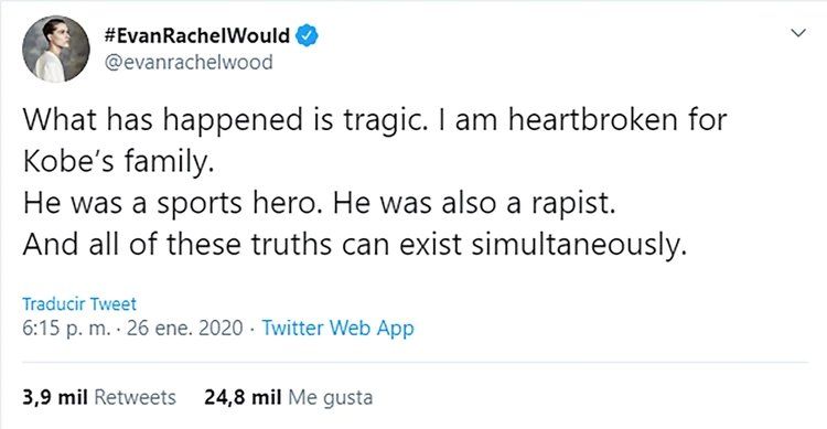 La actriz Evan Rachel Wood fue blanco de críticas por llamar a Kobe Bryant “violador” pocas horas después de su muerte, y fue acusada de llevar el movimiento #MeToo demasiado lejos. “Fue un héroe deportivo. También fue un violador”, expresó la protagonista de Westworld el domingo momentos después de que se supo la noticia de la muerte de la leyenda del baloncesto en un accidente de helicóptero junto a su hija de 13 años, Gianna, y otras siete personas. “Y todas estas verdades pueden existir simultáneamente”.