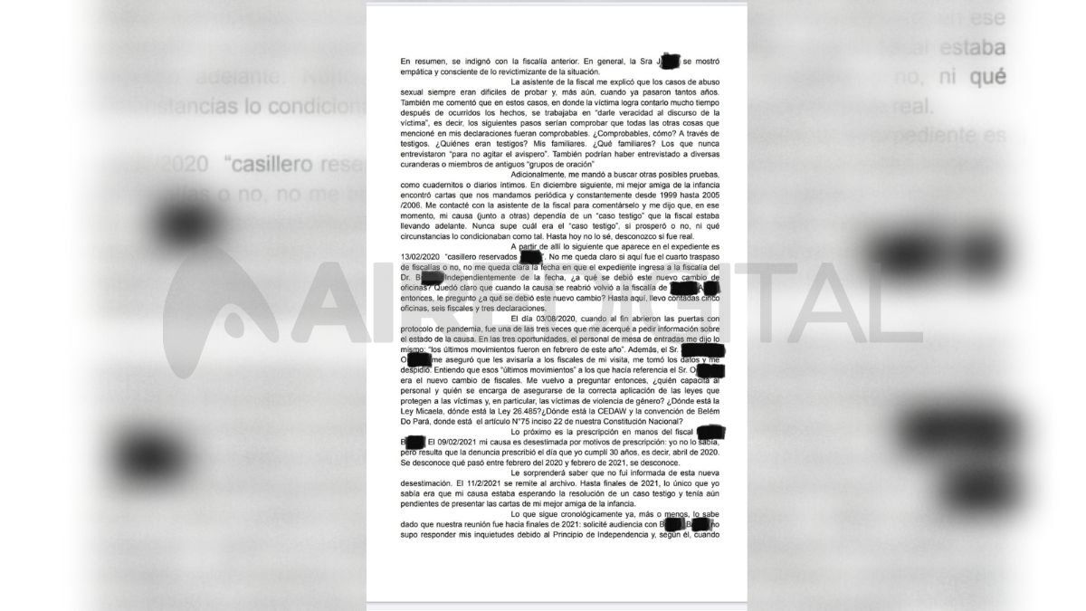 En agosto de 2020, cuando se abrieron las puertas del Ministerio Público de la Acusación con el protocolo de pandemia, N. se acercó a pedir información. Le dijeron que los últimos movimientos habían sido en febrero. “Se desconoce qué pasó entre febrero de 2020 y febrero de 2021”, sigue la cronología. El 11 de febrero de 2021, la causa se remitió al archivo por prescripción.