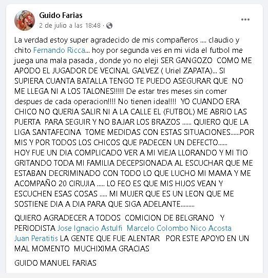 Guido Manuel Farías tiene 30 años y hace más de 20 que juega al fútbol. Actualmente, se desempeña como volante en la Primera de Belgrano de Coronda. Está en pareja y tiene dos hijos pequeños, de cuatro y dos años. Y tiene, además, una admirable historia de lucha y superación que lo acompaña desde siempre, ya que nació con una condición particular en su boca y nariz que le provocó labio leporino y problemas para respirar y hablar. Tuvo su primera cirugía a los tres meses de edad y desde entonces pasó por 20 operaciones, que superó con mucha fortaleza. Pero hay momentos en que esa fuerza flaquea y no alcanza para resistir todos los embates de la vida. Es lo que le ocurrió el pasado sábado en el partido ante Vecinal Gálvez por la Primera División de la Liga Santafesina de Fútbol, cuando un jugador del equipo contrario se valió de su característica física para agredirlo, gritándole "gangoso de m...".