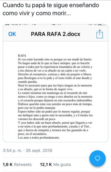 La carta fue compartida en Twitter y generó miles de likes. "Basta con esas cosas hermosas que lloro todo", fue uno de los comentarios. "Bueno, acá estoy, llorando a moco tendido", escribió otra usuaria de la red social. "Se me metió esta carta y el recuerdo de mi viejo en el ojo", compartió otra. "Llegué a leer la mitad porque me puse a llorar en el medio del colectivo. Fantástico", graficó una tuitera.