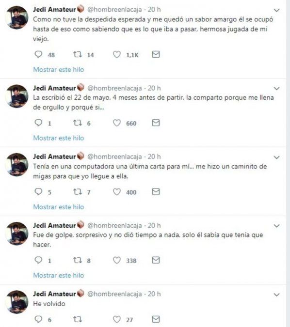 "La comparto porque me llena de orgullo y porque sí... Como no tuve la despedida esperada y me quedó un sabor amargo, él se ocupó hasta de eso como sabiendo que es lo que iba a pasar", se emocionó el hijo.