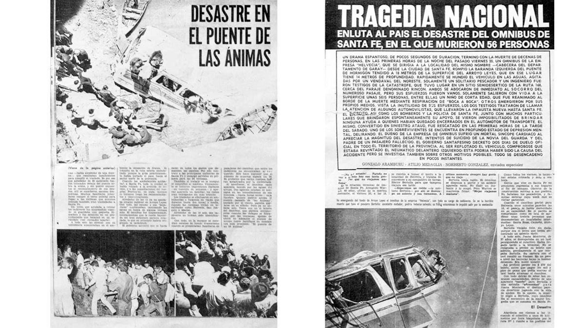 A las 18 horas de aquel 20 de noviembre de 1970, el chofer Juan Dosse emprendió el viaje. Cuarenta minutos más tarde llegó el explosivo impacto del colectivo contra las barandas del puente que cruza el Arroyo Leyes, El estallido de los vidrios, los gritos y el zambullido “en seco” del vehículo en el agua. Cincuenta y cuatro vidas encontraron su final en el lecho de arcilla. Pero la beba Alicia flotó en medio de la tragedia gracias a su bombacha de goma y más tarde la rescataron. Nadie puede olvidar esa imagen, aunque no exista foto alguna.