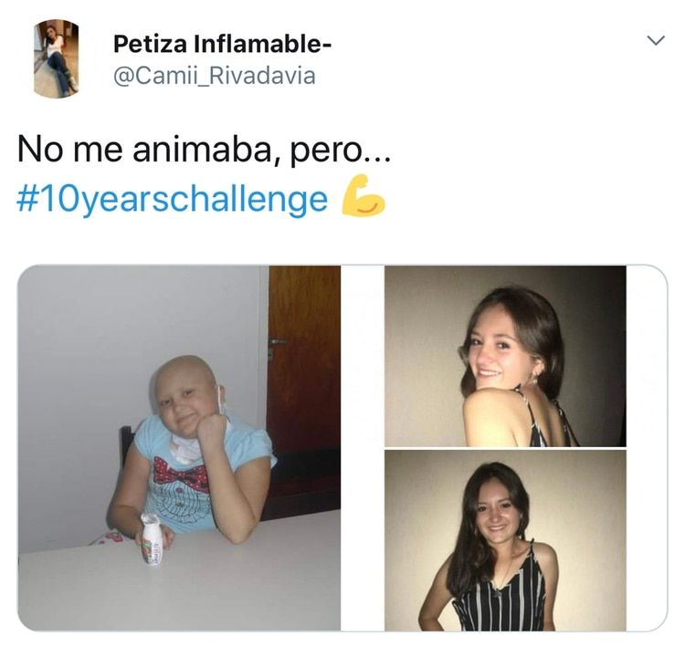 “No me animaba, pero… #10yearschallenge“, fue lo que escribió en Twitter Camila Rivadavia, marplatense de 18 años, antes de sumarse al “desafío de los 10 años”, una consigna que cada vez suma más publicaciones en las redes sociales y que consiste en compartir una foto de hace una década y en simultáneo una actual. Lo divertido es ver las diferencias, reírse de uno mismo. Pero Camila logró darle un nuevo sentido al juego viral.
