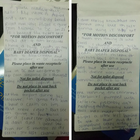 La joven se llama Andrea, y es una joven de 21 años de edad. Ella escribió una nota en un avión mientras volaba de Miami a Washington D.C. En la misma, confiesa estar enamorada de su mejor amigo. La tierna declaración fue encontrada por una persona que se encarga de hacer el aseo en la aeronave. Al leerla se decidió publicarla en las redes, para que la joven pueda contarle si el amor triunfo.