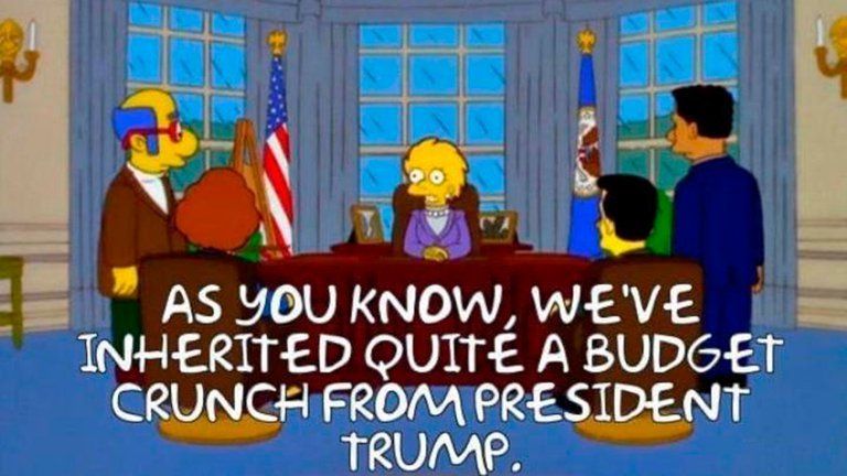 Los Simpsons están llenos de ironías y guiños a la actualidad. Y en este capítulo también se predice que el magnate neoyorquino Donald Trump sería presidente de los Estados Unidos y que no dejaría al país en buenas condiciones cuando se marchara de la Casa Blanca.