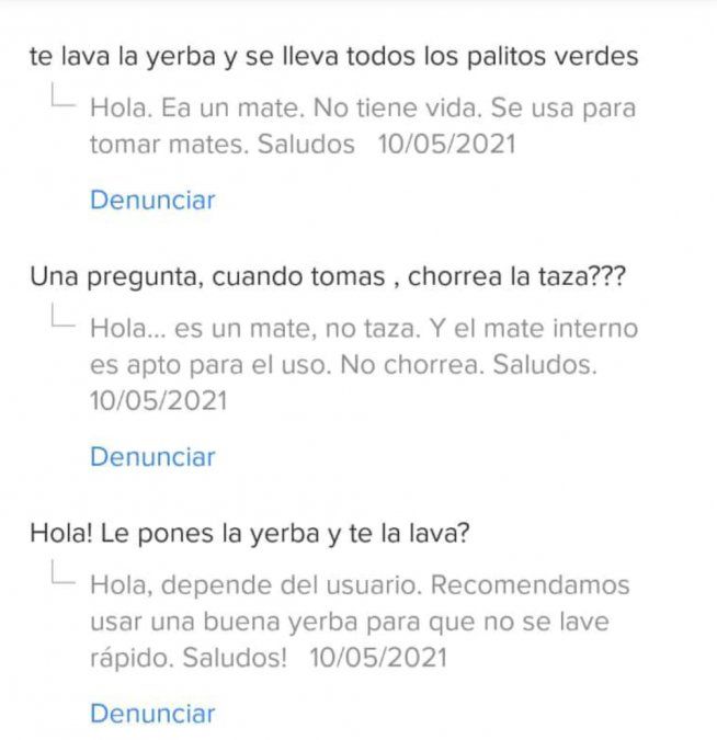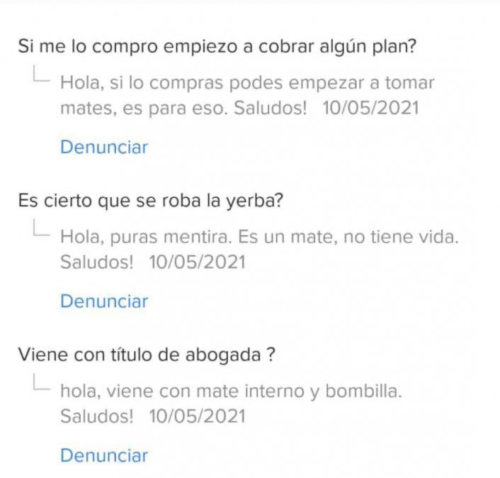 Pero el vendedor, sin tomárselo a pecho, contesta refiriéndose a su producto: “Hola, no hace falta curarlo. Lo lavas y podés empezar a usar”, “Hola, viene con bombilla”, “Hola, puras mentiras. Es un mate, no tiene vida”, decía en respondiendo respectivamente.
