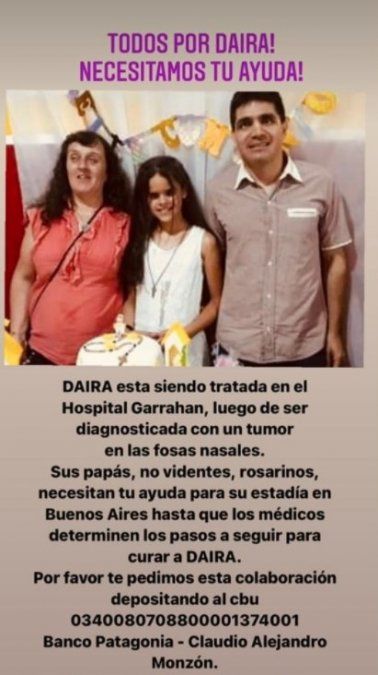 Si bien Daria aún no está internada, se esperan los resultados de la biopsia esta semana para saber cómo afrontar el cuadro, que necesitará de un tratamiento en el Hospital Garrahan de Buenos Aires.