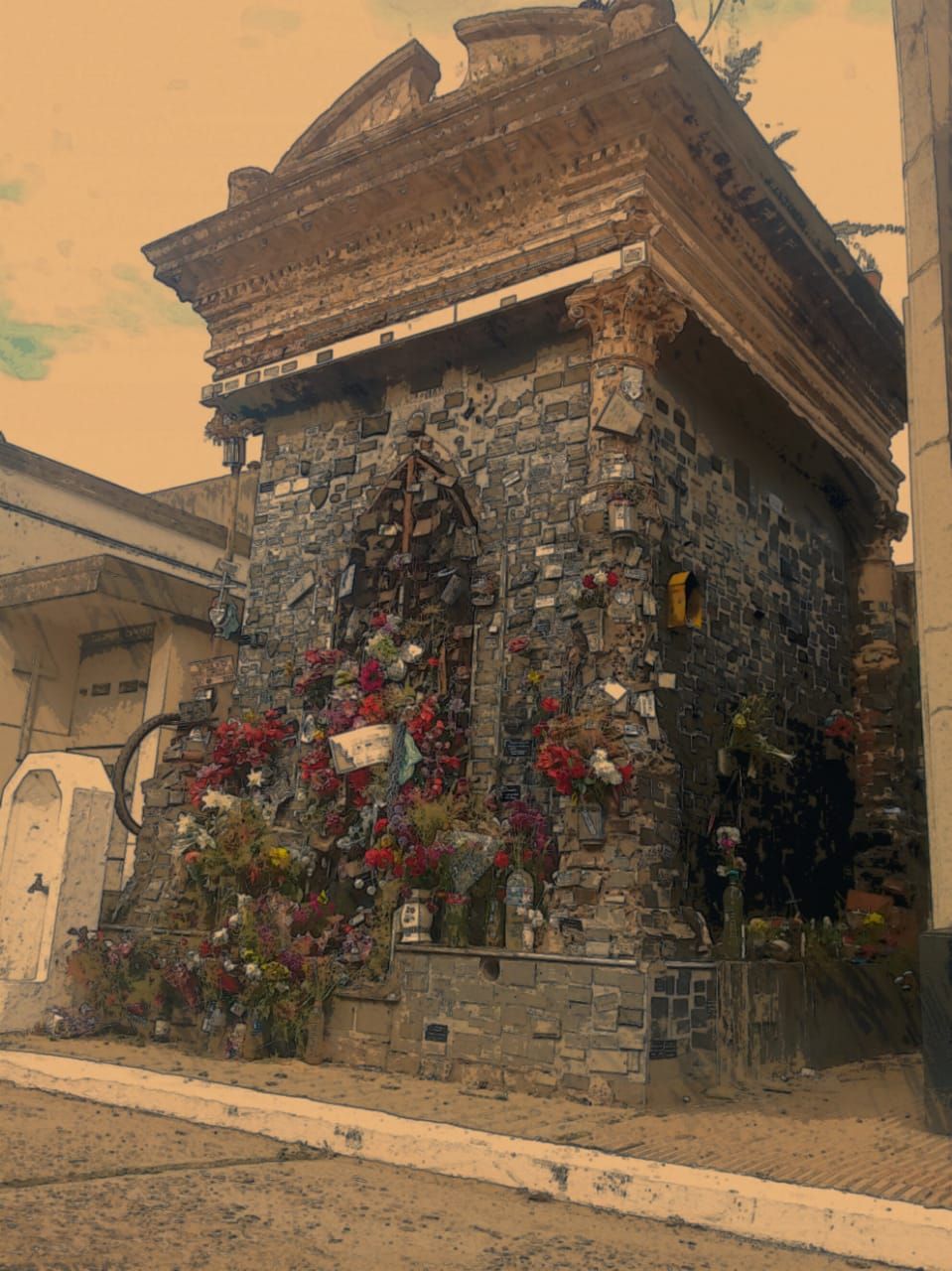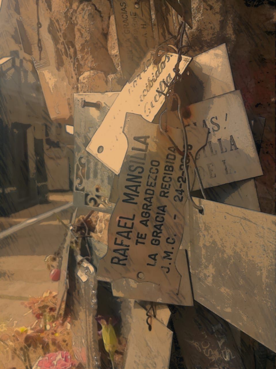 —Hará 50 o 60 años atrás que empezó a haber más fervor por parte de la gente. En un tiempo había dos o tres placas, algunas flores. Pero de pronto fue como un estallido. Se llenó la fachada de placas, de imágenes de santos, de crucifijos. Nosotros no sabíamos bien qué hacer porque nunca supimos nada de él.