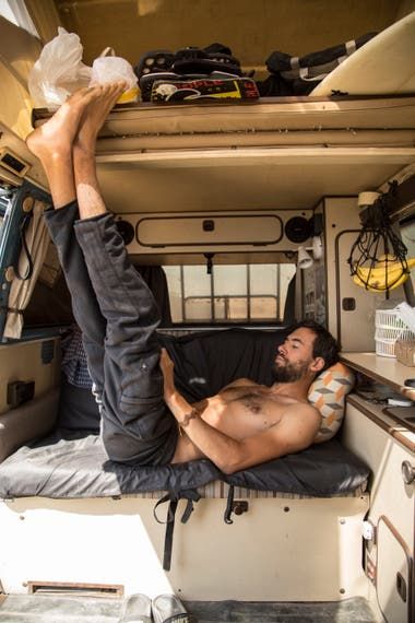 Una vez que la van ya estaba en sus manos, todavía debían pensar en cómo sustentar el viaje, que en ese momento iba a durar un año ( spoiler alert: está durando bastante más). Su principal idea era trabajar en los distintos lugares haciendo fotos (Oli) y dando clases de Kitesurf (Álvaro), pero también salieron a conseguir marcas auspiciantes con las que pudieran trabajar a lo largo del camino. El tema era que, entre los arreglos de la Westy y los costos de los primeros días de viaje en los que todavía no tendrían trabajo, sabían que iban a necesitar ayuda para cubrir muchos gastos iniciales. Entonces se les ocurrió que, ya que se iban a casar y todo el mundo les preguntaba qué querían de regalo, pedirían que les regalaran kilómetros: “Al poco tiempo apareció un amigo que nos armó una página web y ahí la gente nos iba regalando kilómetros y enterándose bien cómo sería nuestra aventura”, explica Oli.