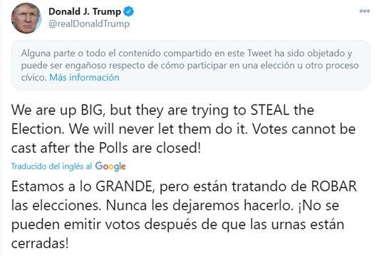 A horas de celebrarse la elección en Estados Unidos y en pleno recuento de votos, Trump denunció fraude con el siguiente mensaje: “Están intentando ROBAR las elecciones. No dejaremos que lo hagan. ¡No se puede votar después del cierre de las urnas!”.