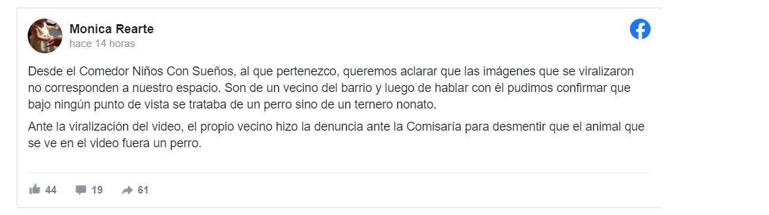 "Desde el Comedor Niños Con Sueños, al que pertenezco, queremos aclarar que las imágenes que se viralizaron no corresponden a nuestro espacio. Son de un vecino del barrio y luego de hablar con él pudimos confirmar que bajo ningún punto de vista se trataba de un perro sino de un ternero nonato", explica la usuaria Mónica Rearte en el comunicado.