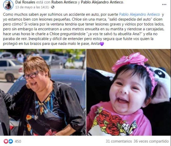 Tras el accidente, los tres fueron trasladados al hospital. Los padres de Chloe sufrieron algunas lesiones y heridas cortantes, pero se encuentran fuera de peligro. “A Chloe la encontraron a unos metros envuelta en su mantita y riéndose a carcajadas”, detalló aún asombrada por lo sucedido. Hace unas horas le charlé a Chloe preguntándole ‘¿a vos te salvó tu abuelita Ana?’ y ella no paraba de reír”, resaltó.