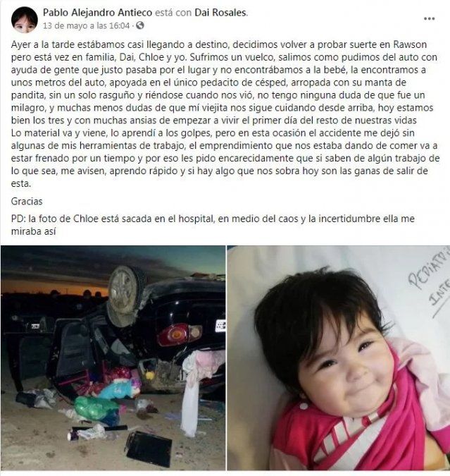 Se podría decir que Chloe Antieco volvió a nacer el pasado 12 de mayo, luego de sobrevivir -sin ningún tipo de lesiones- al vuelco del vehículo familiar que viajaba sobre la ruta 3, hacia la ciudad de Trelew. El brutal accidente de tránsito afortunadamente no se convirtió en tragedia y la historia de la beba rápidamente se hizo viral, luego de que el papá de la beba de pocos meses relatara lo ocurrido a través de Facebook.