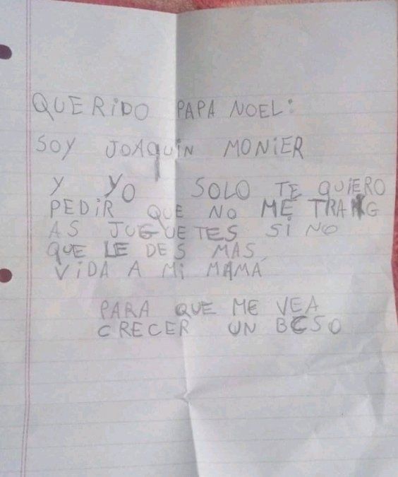 En el momento de escribir su tradicional carta a Papá Noel, el pequeño priorizó la salud de su madre por encima de todos los juguetes que desea: "Yo sólo quiero pedirte que le regales a mi mamá más salud. Ella tiene cáncer como mi abuela que está en el cielo y la verdad es que quiero tenerla por mucho tiempo más".