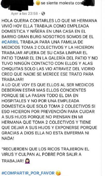 "Trabaja para una familia de médicos. Toma dos colectivos para ir al hogar de sus jefes y cuando llegó la hicieron trabajar únicamente en el patio. El único contacto que tuvieron con ella fue a través de un vidrio. Al se médicos deberían ser más conscientes y no tener ese trato con mi hermana", manifestó indignada.