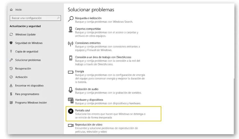 - En aquellas opciones aparecerá una referida a la Pantalla azul.