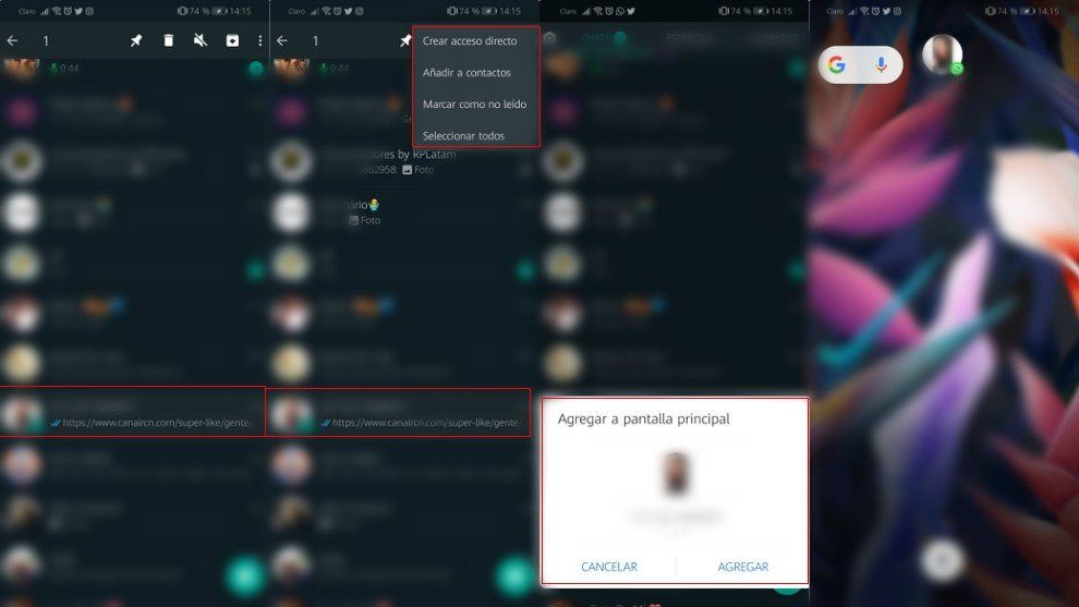 Lo primero que hay que hacer es entrar a WhatsApp, mantener presionado un chat, luego ir a los tres puntos que se encuentran en la parte superior derecha de la aplicación, seleccionar la opción de "crear acceso directo", después de eso aparecerá un cuadro de dialogo que dice "agregar a pantalla principal", se da clic en "agregar automáticamente" y listo.