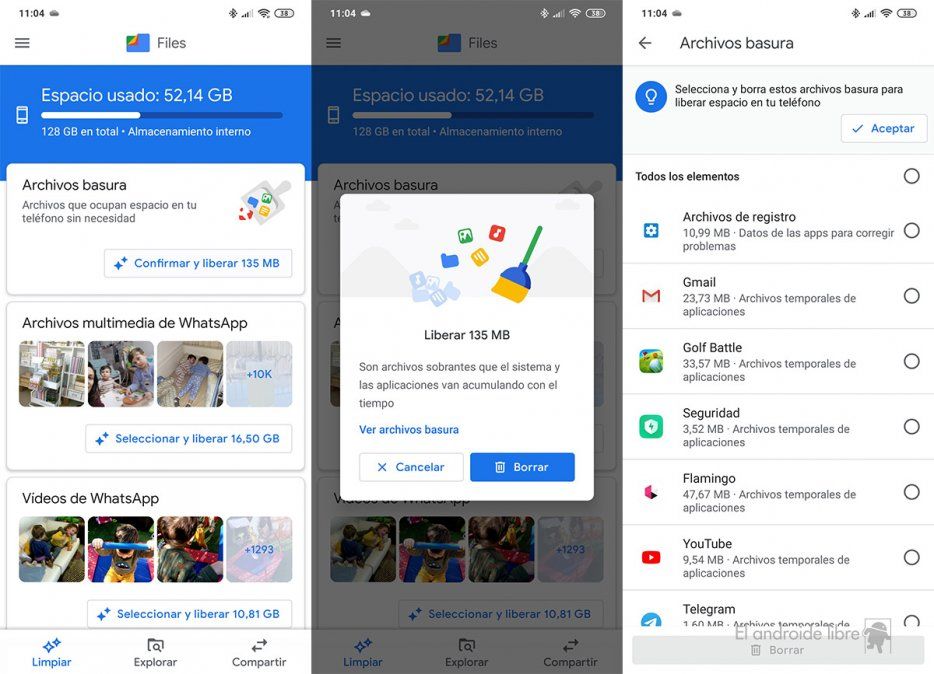 Si queremos hacer este proceso de una manera eficiente, podemos recurrir a aplicaciones para liberar memoria en Android. Tenemos aplicaciones como Files de Google, que nos va a permitir liberar memoria de una manera sencilla, permitiendo que aquellos archivos que no sean necesarios y estén ocupando espacio de forma innecesaria en el teléfono se vayan a eliminar. Sobre todo porque nos permitirá eliminar archivos duplicados, que es algo complicado a veces.
