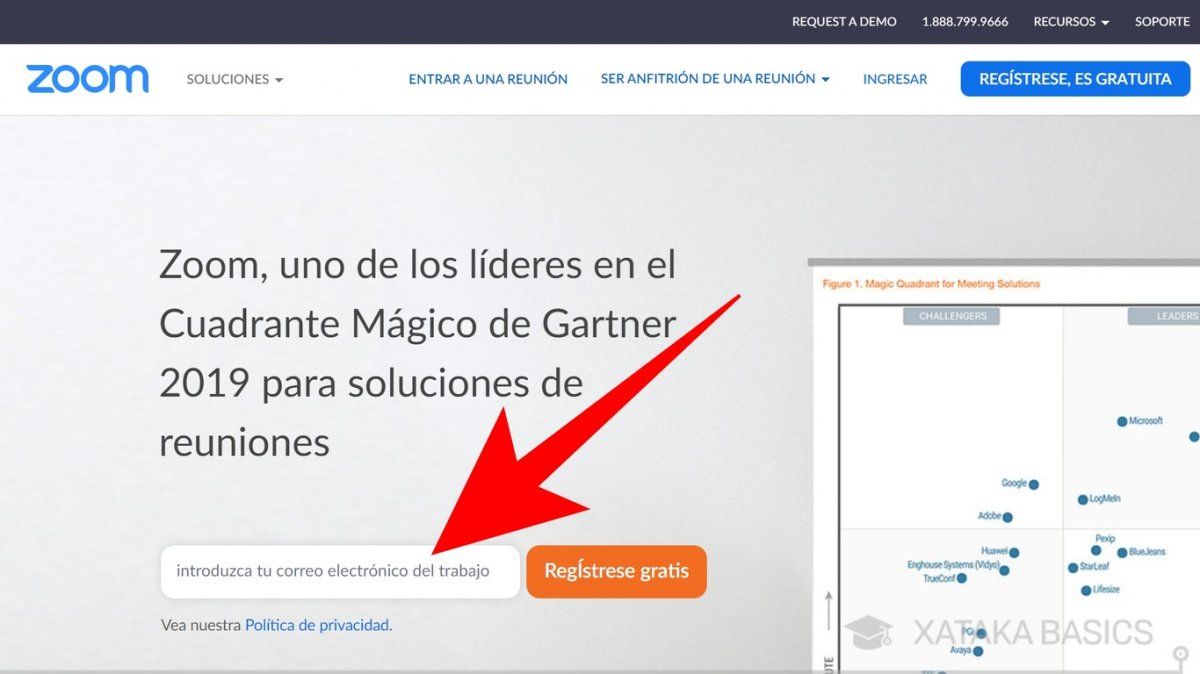 Así pues, lo primero que tienes que hacer es entrar en Zoom.us y crearte una nueva cuenta. Para ello, lo más rápido es escribir tu correo electrónico en el campo que te señalamos y pulsar en Regístrese gratis. Te aparecerá una ventana emergente de confirmación donde tienes que pulsar en Confirmar. Luego te aparecerá una ventana en la que se te pide permiso para enviarte correos, y aquí podrás Confirmar o cambiar las preferencias para cancelar la suscripción a newsletters.