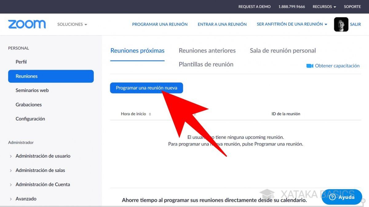 A continuación, tienes que ir a la sección Reuniones de Zoom, pulsando en ella en la columna izquierda del panel que aparece cuando entras a tu cuenta, o directamente en la dirección zoom.us/meeting. En ella, pulsa en el botón de Programar una reunión nueva que te aparecerá en la pestaña de Reuniones próximas.