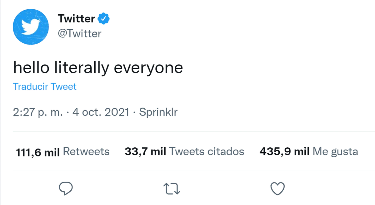 “Hola literalmente a todos”, publicó la red social en motivo a la caída del resto de las aplicaciones de este lunes. Además, anunciaron que las versiones web tampoco funcionan. En menos de una hora el posteo superó los 111 mil retweets y tuvo miles de respuestas de los internautas de todo el mundo.