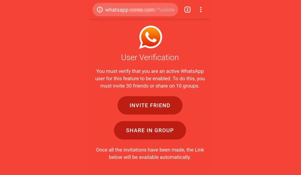 “Esta es la función secreta para activar el Modo Oscuro de tu cuenta WhatsApp”, dice la notificación. Después de acceder al enlace, la página pide al usuario que comparta el mensaje a más contactos para poder activar el deseado modo. “Envía el mensaje de 5 a 10 amigos o grupos de WhatsApp, haz clic en continuar y activarás el modo oscuro”, promete.