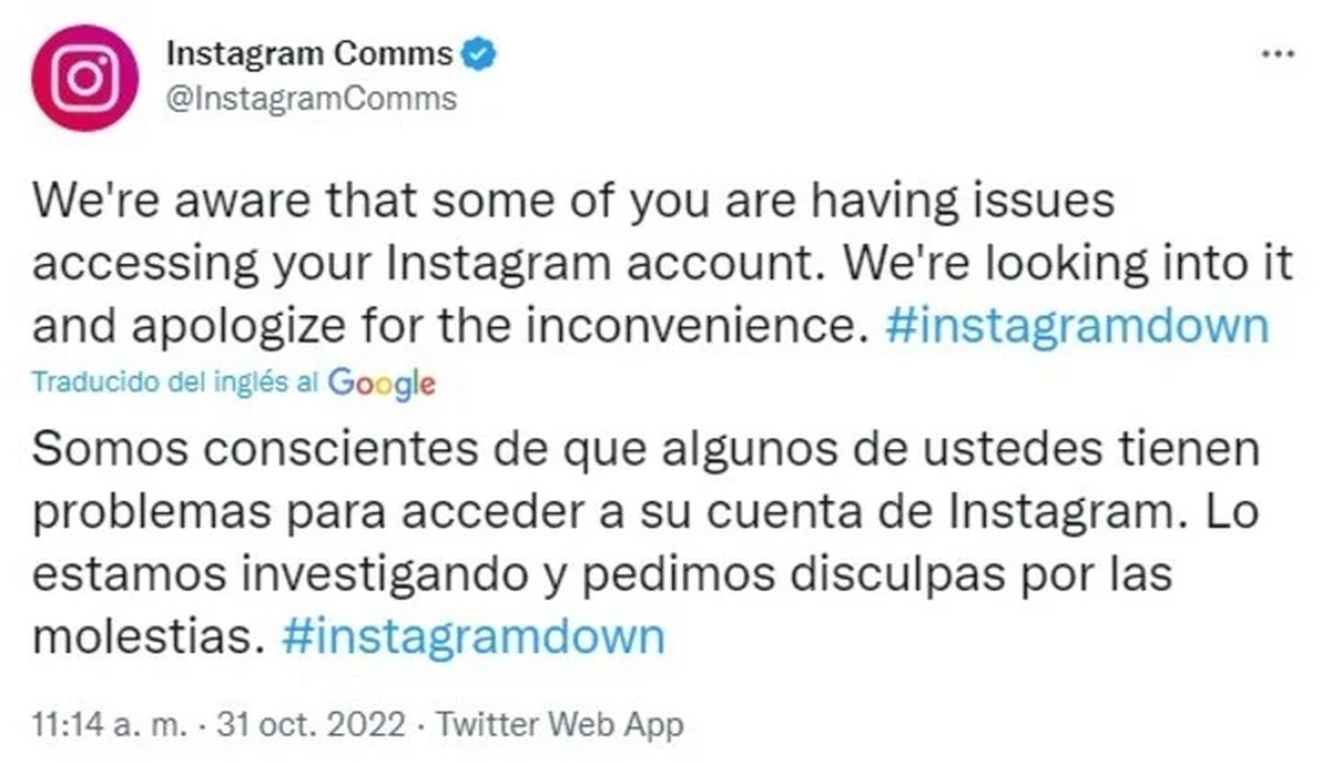 "Somos conscientes de que algunos de ustedes tienen problemas para acceder a su cuenta de Instagram. Lo estamos investigando y pedimos disculpas por las molestias", publicó la cuenta oficial de la red social en Twitter.