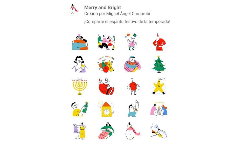 Estos stickers fueron creados por Miguel Ángel Camprubí y llevan por descripción lo siguiente: "Comparte el espíritu festivo de la temporada". Entre ellos hallarán un árbol de navidad, un sexy santa, el candelabro, el reloj de las 12, la estrella del arbolito, entre otros como informa El Comercio.