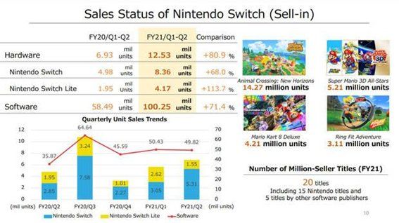Las ventas de Switch han aumentado un 80,9 % respecto al mismo periodo del año fiscal 2020 (de abril a septiembre de 2019). La Switch estándar ha vendido un 68 % más. Switch Lite ha más que duplicado sus ventas, pues crece un 113,7 %. El histórico nos dice que en el tercer trimestre, entre septiembre y diciembre, es cuando más consolas venden; el año pasado pasaron de 35,87 millones entre julio y septiembre a 64,64 millones entre septiembre y diciembre.