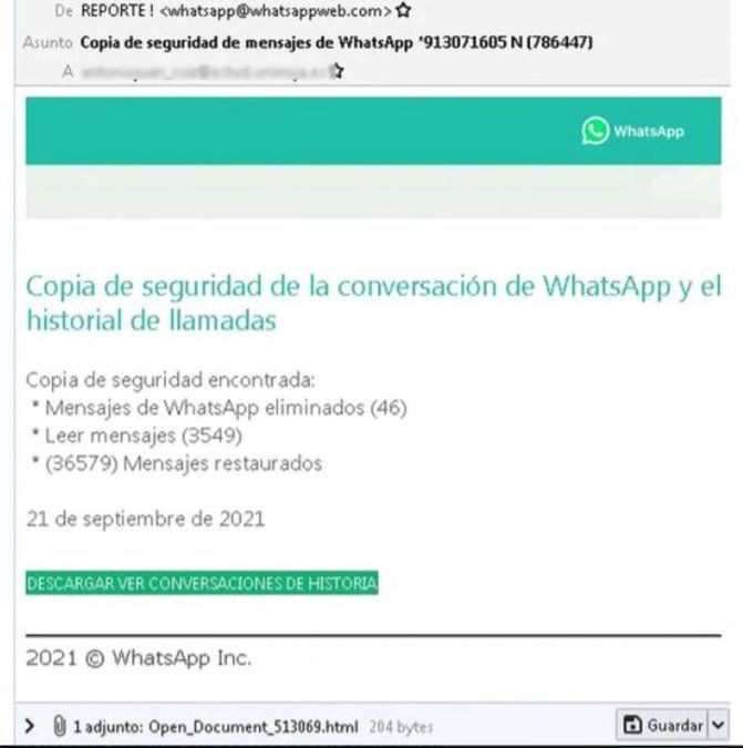 La estafa fue revelada por el Instituto Nacional de Ciberseguridad de España (Incibe) en un aviso de seguridad, en el que informa sobre la existencia de mensajes de phishing con el asunto “Copia de seguridad de mensajes de WhatsApp”.