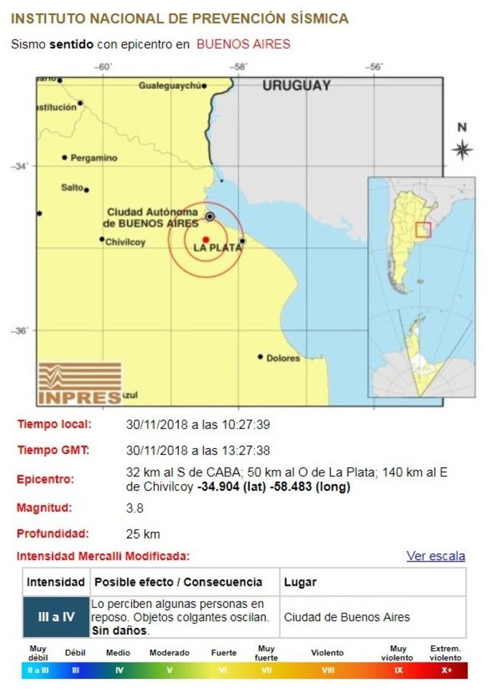 Poco después, el INPRES confirmó la información en su página web: a las 10.27.38 del viernes, hubo un sismo de 3,8 de magnitud a 25 kilómetros de profundidad en la provincia de Buenos Aires.