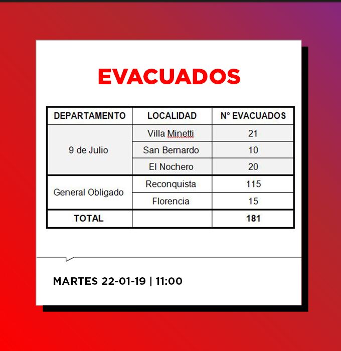 En Villa Minetti, que llegó a tener 132 evacuados luego de que la defensa cediera y el agua inundara el 85% de la ciudad, sólo quedan 21 personas alojadas en centros de emergencia. Tostado y Santa Margarita, dos de las localidades del departamento 9 de Julio que también tuvieron un elevado número de personas que debieron abandonar sus hogares, ya no tienen evacuados.