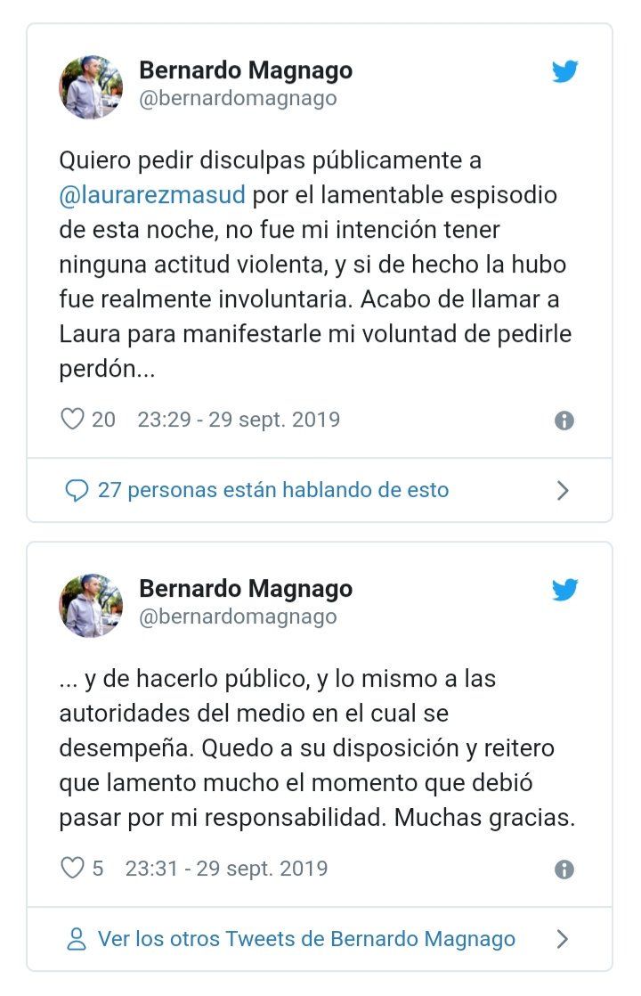 “Quiero pedir disculpas públicamente a Laura Rez Masud por el lamentable episodio de esta noche, no fue mi intención tener ninguna actitud violenta, y si de hecho la hubo fue realmente involuntaria. Acabo de llamar a Laura para manifestarle mi voluntad de pedirle perdón…”