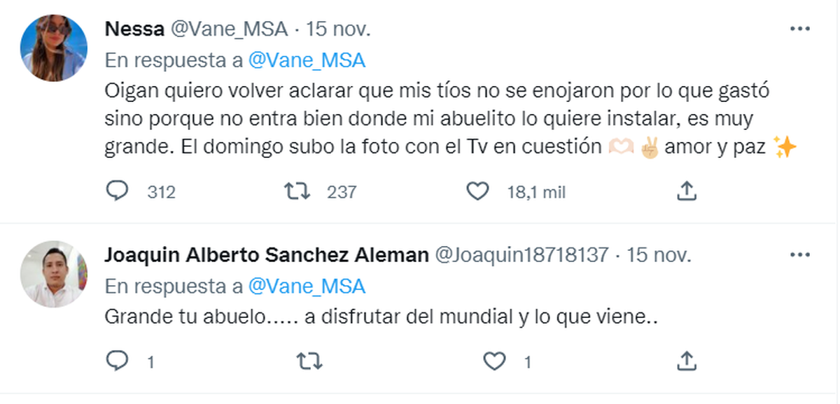 "Mi abuelito de 85 años se compró ayer un mega televisor, unos tíos fueron a reclamarle y él les dijo: va a ser mi último mundial", compartió la chica bajo el usuario @Vane_MSA.