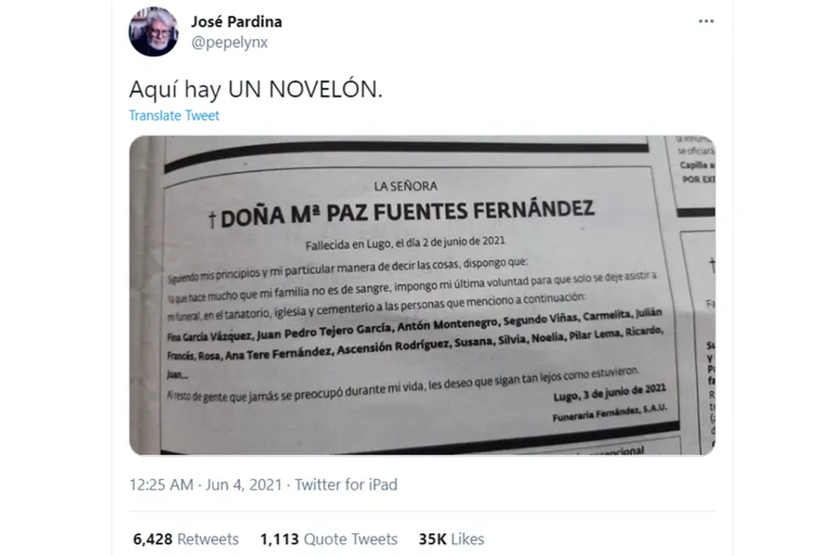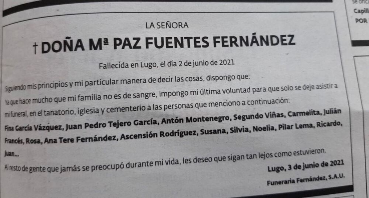 En Twitter se viralizó la imagen de un aviso fúnebre donde una persona identificada como “La señora Mª Paz Fuentes Fernández” enumeró con nombre y apellido los invitados a su despedida. Pero eso no es todo: también dejó un mensaje fulminante para quienes quedaron afuera de la selección.