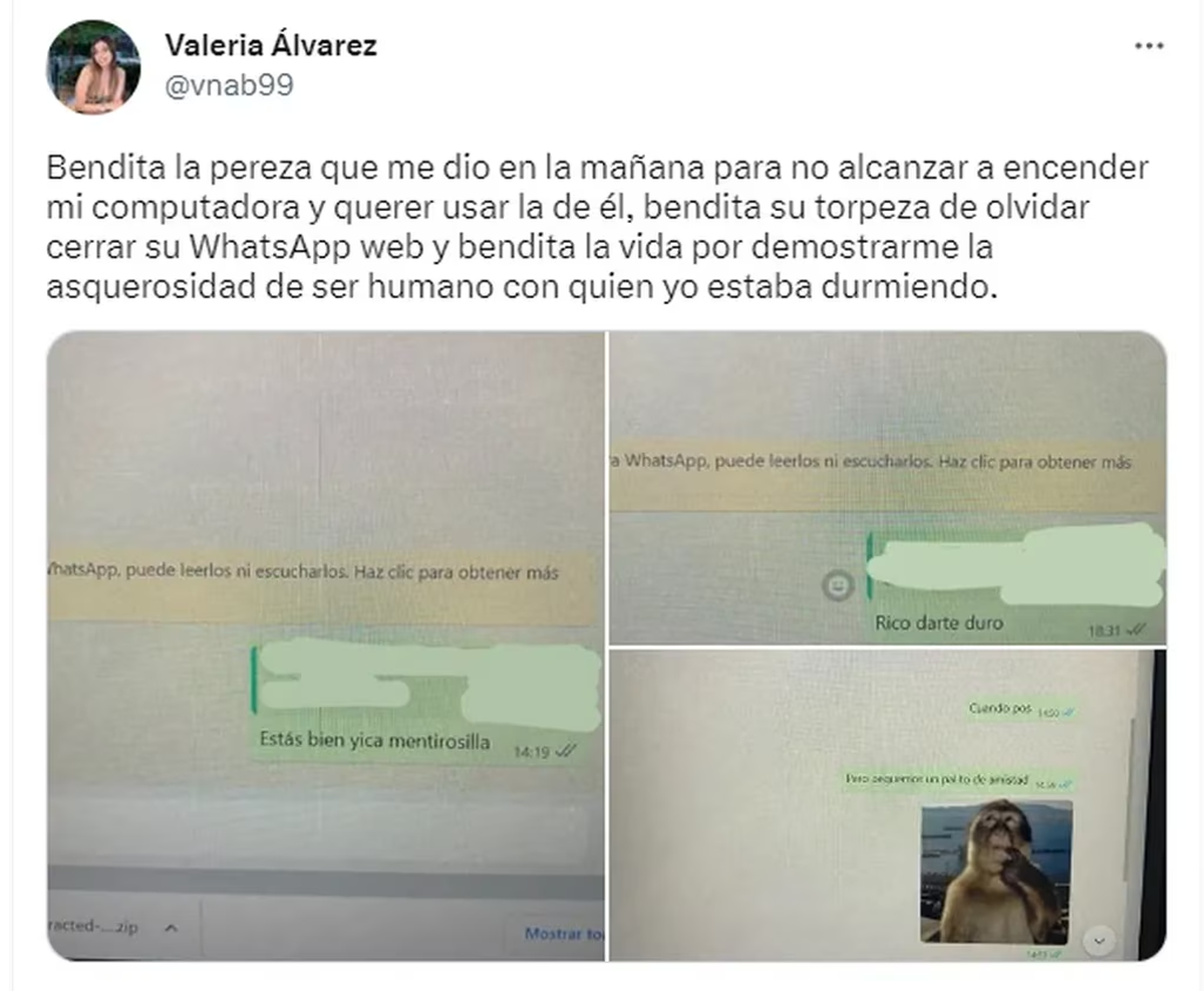 “Bendita la pereza que me dio en la mañana para no alcanzar a encender mi computadora y querer usar la de él, bendita su torpeza de olvidar cerrar su WhatsApp Web”, escribió en su cuenta de Twitter.