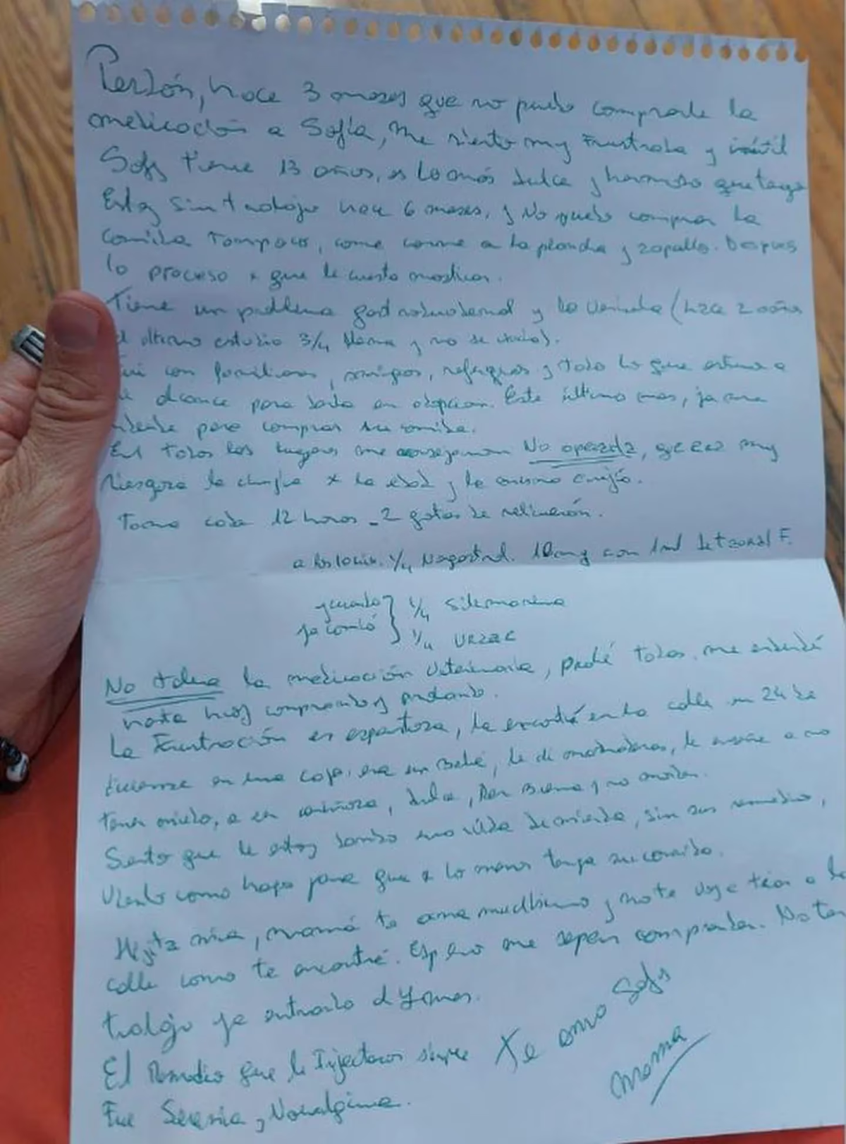 La dueña de Sofía, en una conmovedora carta, explicó todos los motivos detrás de la drástica decisión. La mujer, además, dio los detalles de la medicación y la alimentación que Sofía debería seguir y que, por su situación económica, se le volvió imposible de seguir costeando.