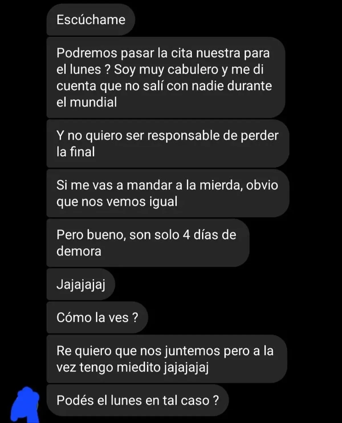 “Escuchame, ¿podremos pasar nuestra cita para el lunes? Soy muy cabulero y me di cuenta de que no salí con nadie durante el mundial, y no quiero ser responsable de perder la final”, le dijo.