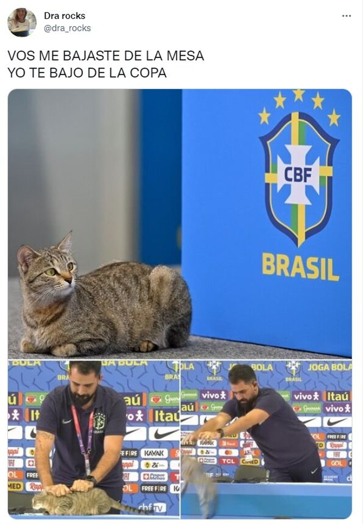 El controversial momento que se vivió en una de las últimas conferencias de prensa de la selección verdeamarela cuando un integrante de la delegación sacó de manera brusca a un gato que se había colado en el evento, fue uno de los símbolos que los usuarios tomaron para enrostrarle la derrota a equipo de Neymar, acusando al equipo de haberse provocado mala suerte.
