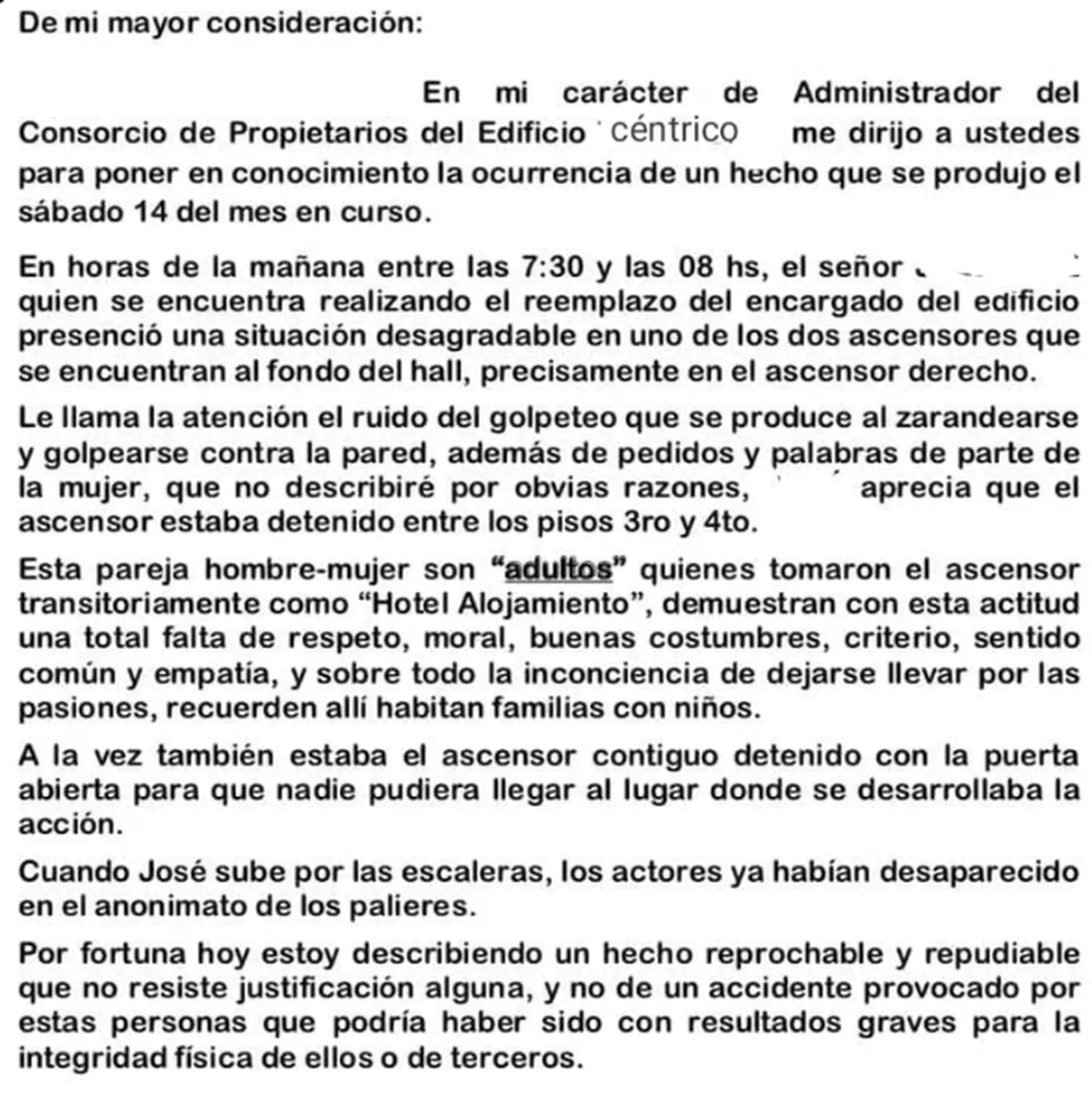 Cuando logra destrabar el ascensor que se encontraba parado entre el tercer y el cuarto piso descubrió a una pareja teniendo relaciones sexuales.