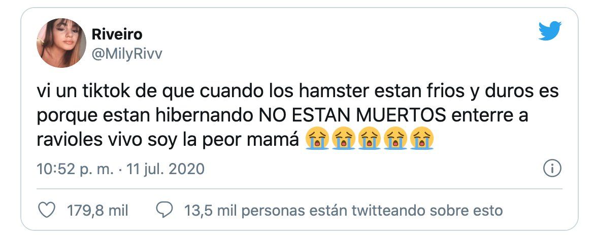 "Vi en un [video de] TikTok que cuando los hámsters están fríos y duros es porque están hibernando, no están muertos. Enterré a Ravioles vivo: soy la peor mamá", escribió una usuaria en la red social. Rápidamente, su posteo cosechó el interés de miles de personas: en solo tres días tuvo casi 180.000 Me Gusta, más de 19.000 y un sinfín de comentarios.