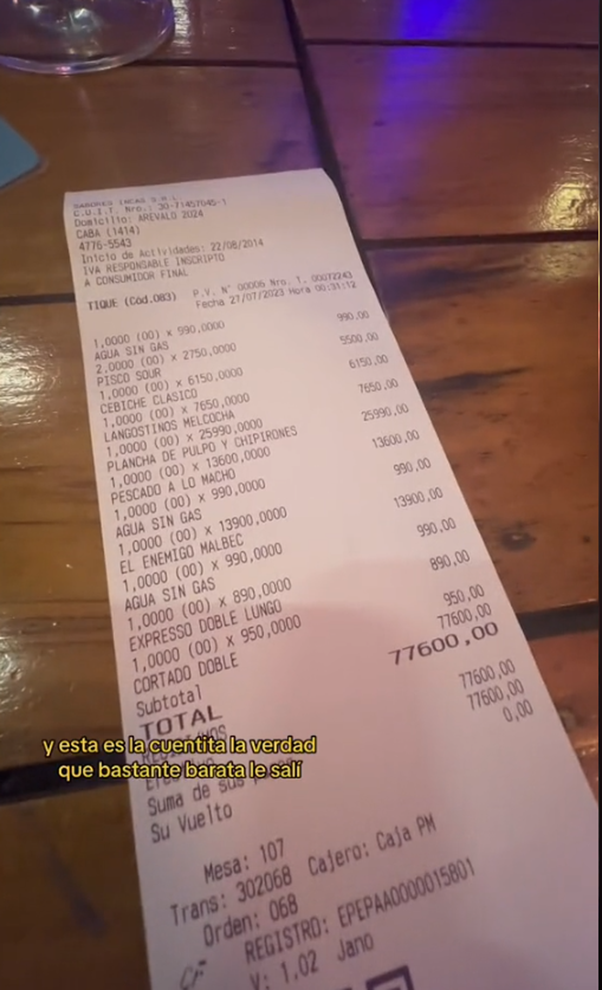 Casi terminando el clip, la usuaria comentó que para la hora del postre ya estaba muy satisfecha, por lo que optó por un café. Ya al final del video, la joven compartió el dato que más sorprendió a todos y fue el total de la cuenta de la cena que tuvo que pagar su “sugar daddy” y, tal como se ve, el monto era de 77.600 pesos. “La verdad que bastante barata le salí”, cerró diciendo la usuaria.