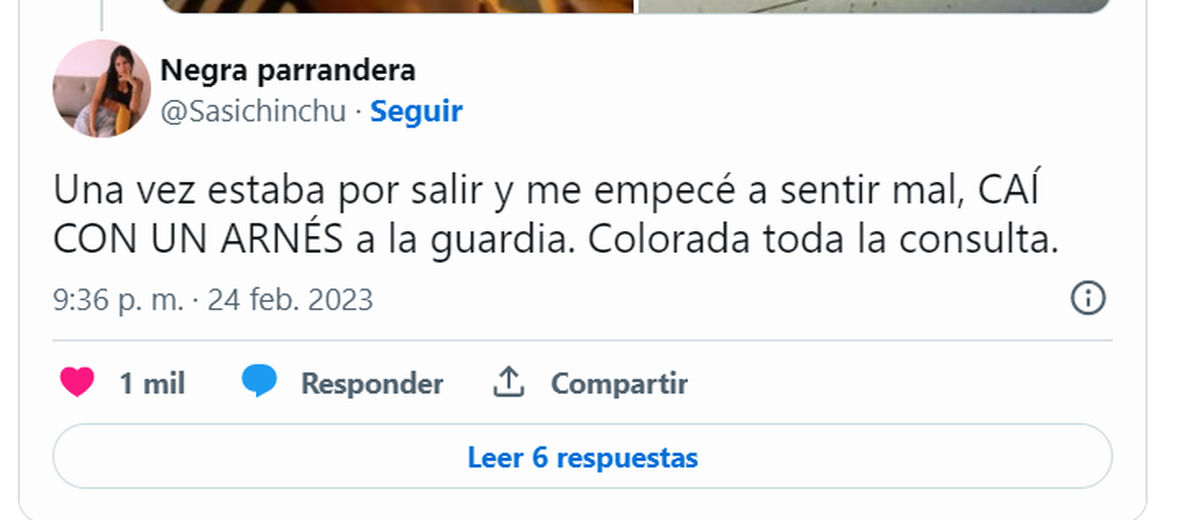 La publicación ya superó los 35.000 Me gusta en Twitter y logró divertir a sus seguidores. Al mismo tiempo, sumaron sus experiencias de infarto. “A mí me pasó eso, con la diferencia de que el médico ¡ERA MI SUEGRO!”, contó una usuaria; “yo vengo planteándome comprar ropa interior exclusivamente para ir al médico”, agregó otra. Una joven todavía no ha superado la vergüenza: “¡Me re pasó! Hasta me operaron. Era tan pequeña la ropa interior que me la devolvieron en una bolsita de papel madera”.