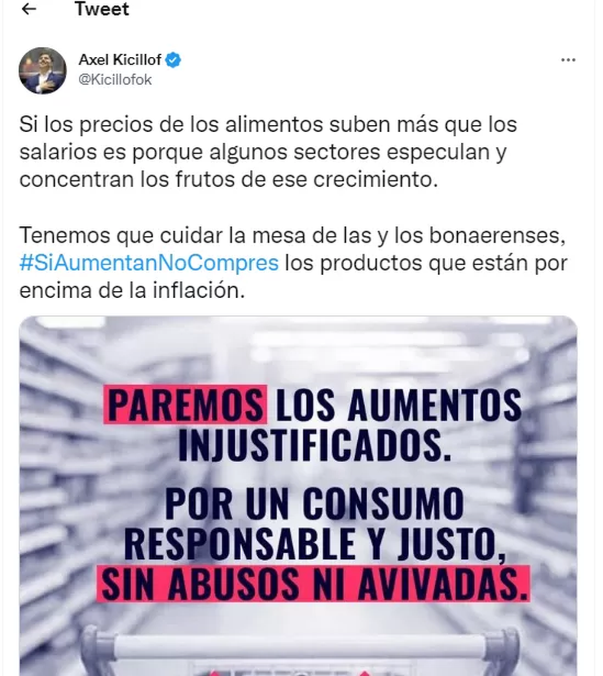 "Si los precios de los alimentos suben más que los salarios es porque algunos sectores especulan y concentran los frutos de ese crecimiento. Tenemos que cuidar la mesa de las y los bonaerenses, #SiAumentanNoCompres los productos que están por encima de la inflación", manifestó el gobernador.