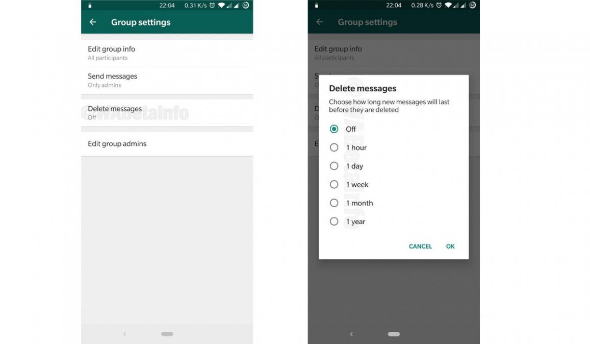 A principios de octubre, el programa de prueba de WhatsApp ya mostró la opción "Desaparición de mensajes", que introducía en los ajustes de Grupo un tiempo -cinco segundos o una hora- tras el cual los mensajes desaparecerían automáticamente.