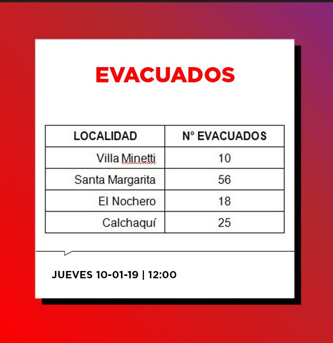 Los 109 evacuados provienen de cuatro localidades: Santa Margarita (56), El Nochero (18), Villa Minetti (10) y Calchaquí (25).